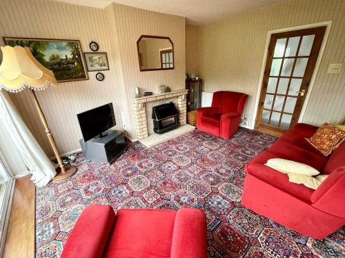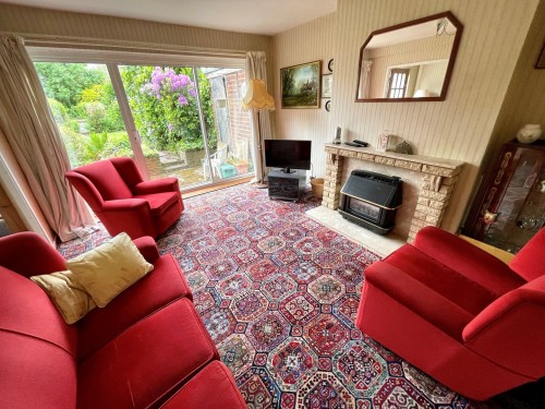 3.6m x 4.1m (11' 10" x 13' 5") Yorkstone fire place with constituted marble hearth and fitted gas fire, radiator, patio door leading to the rear garden and double doors leading to the dining room.