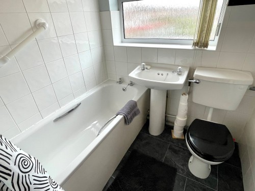 1.7m x 1.8m (5' 7" x 5' 11") Radiator and white suite comprising, panelled bath with Triton shower unit over, low flush wc and pedestal wash hand basin.