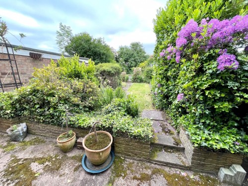 A block paved driveway leads past a lawn area to the detached brick built garage. There is side access to the rear garden with patio and raised lawn area with borders containing a variety of mature shrubs and plants.