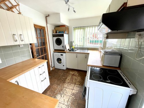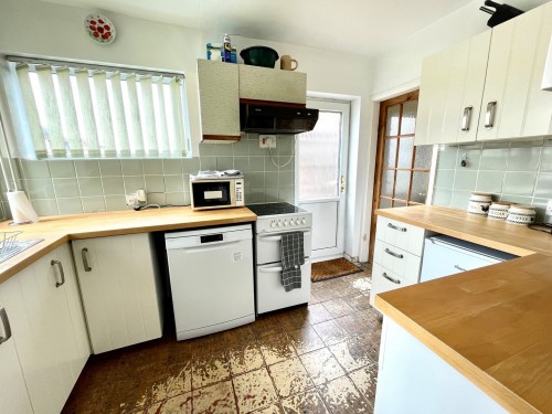 2.3m x 3.3m (7' 7" x 10' 10") Wall and base cupboards with matching work surfaces incorporating stainless steel sink unit, splash back tiling, plumbing for washing machine, windows to front and side and side door leading to the driveway.