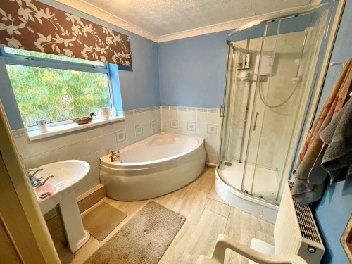 Corner bath, curved shower enclosure, pedestal wash hand basin, airing cupboard and radiator.