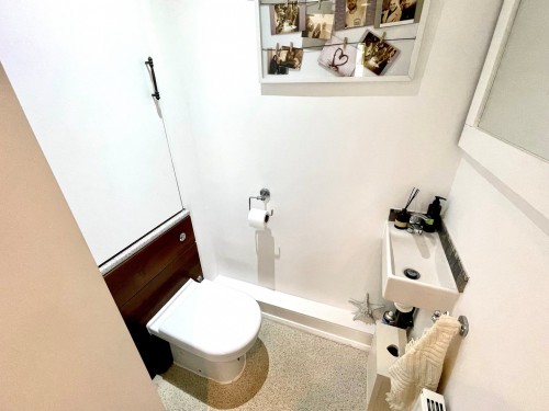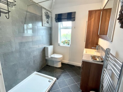 Having heated towel rail, shower enclosure, low flush wc and vanity unit with wash hand basin.