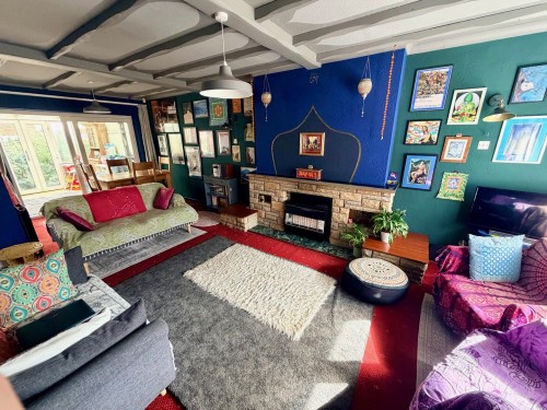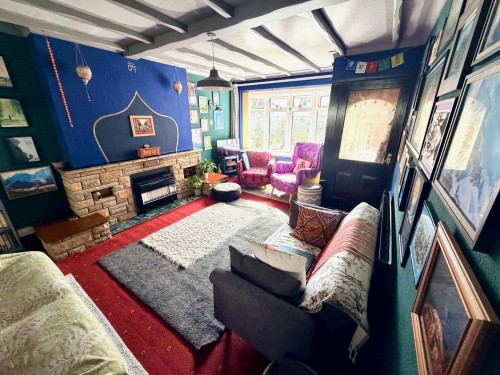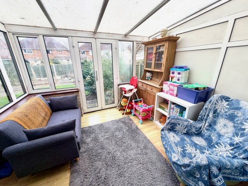 3.7m x 7.3m (12' 2" x 23' 11") max. Bow window to front, Yorkstone fireplace with fitted gas fire, two radiators, two wall light points, stairs off and Patio door leading to the conservatory.