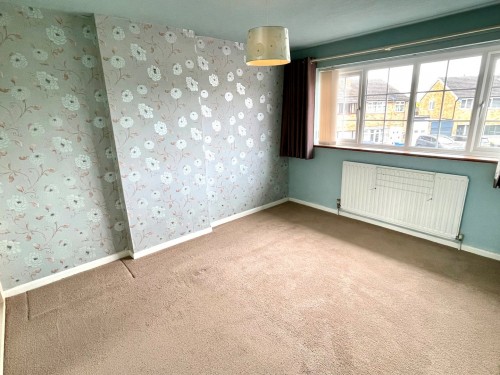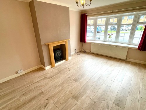 3.2m x 4.3m (10' 6" x 14' 1") Bow window to front, radiator, laminate floor and feature fireplace.