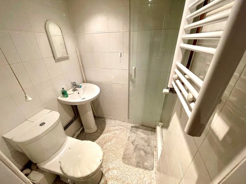 Being fully tiled to all exposed walls, heated towel rail and white suite comprising, shower enclosure, Saniflow wc and pedestal wash hand basin.