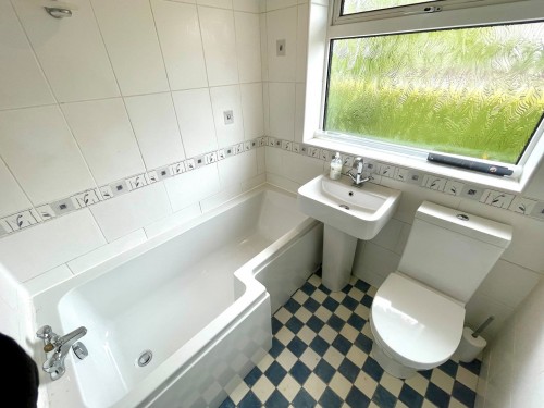 Being fully tiled to all exposed walls, heated towel rail and white suite comprising, P Shaped bath with mixer shower over, pedestal wash hand basin and low flush wc.