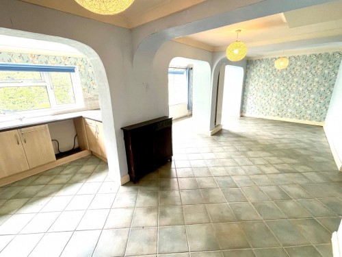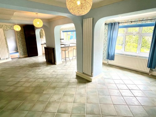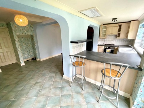 8.2m x 4.7m (26' 11" x 15' 5") max. Wall nd base cupboards with granite effect work surfaces incorporating a one and a half bowl sink unit with mixer tap, splash back tiling, built in double oven, separate gas hob, overhead extractor, plumbing for dishwasher, ceramic tiled floor, windows to rear, three radiators, breakfast bar and French door to rear garden.