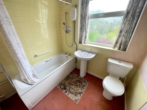 2.0m x 2.2m (6' 7" x 7' 3") Having radiator and white suite comprising, panelled bath with shower over, pedestal wash hand basin and low flush wc.