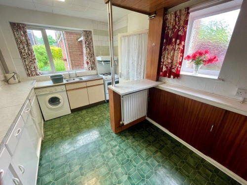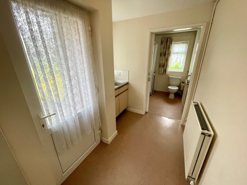 2.7m x 3.7m (8' 10" x 12' 2") Wall and base cupboards , work surfaces incorporating a stainless steel sink unit, splash back tiling, gas cooker point, radiator, plumbing for washing machine, window to rear, under stairs cupboard and side door to rear lobby.