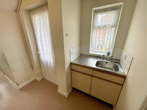 2.1m x 4.4m (6' 11" x 14' 5") max. Door to front, base cupboard with stainless steel sink unit and doors to rear garden and wet room.