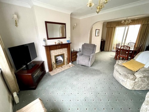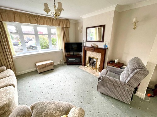 4.2m x 3.5m (13' 9" x 11' 6") Bow window to front, two wall light points and feature fireplace with flame effect gas fire.