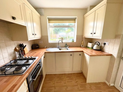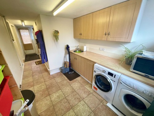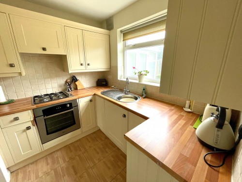2.4m x 1.9m (7' 10" x 6' 3") Having a range of wall and base cupboards with matching work surfaces incorporating a circular stainless steel sink unit, splash back tiling, built in oven, separate electric hob, overhead extractor,ceramic tiled floor, window to rear and side door to the utility room.
