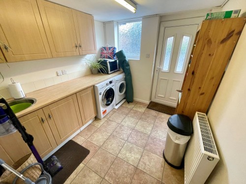 2.4m x 6.9m (7' 10" x 22' 8") max. Wall and base cupboards, Saniflo plumbing for washing machine and UPVC doors to front and rear.
