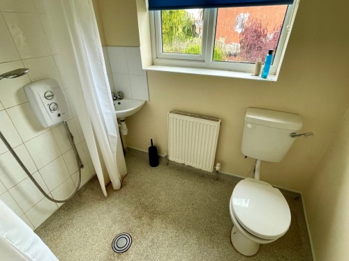 Triton electric shower unit, wash hand basin, low flush wc and radiator.