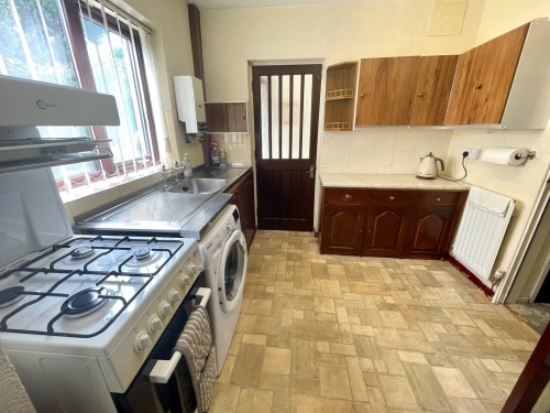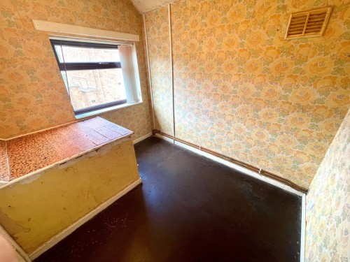 2.4m x 2.7m (7' 10" x 8' 10") Wall and base cupboards, work surfaces incorporating stainless steel sink unit, splash back tiling, gas cooker point, plumbing for washing machine, radiator and window to rear.