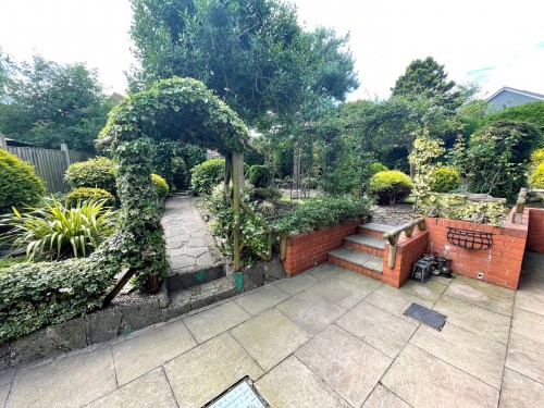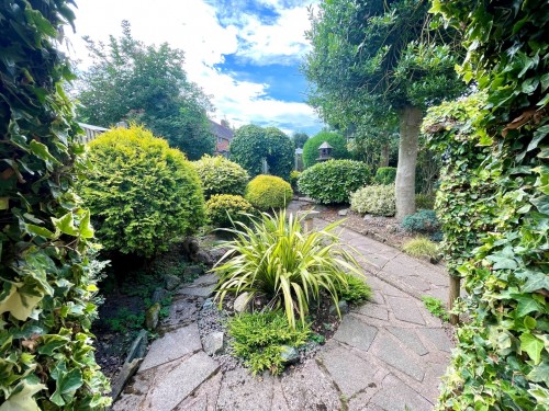 A pathway leads past an extensive lawn area set behind a privet hedge. There is side access to the enclosed landscaped large rear garden having patio and flower beds containing a variety of trees and mature shrubs and plants.