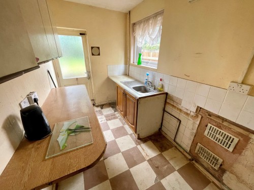 1.8m x 3.1m (5' 11" x 10' 2") Having wall and base cupboards, work surfaces with stainless steel sink unit, splash back tiling, window to side, plumbing for washing machine and door to rear garden