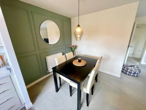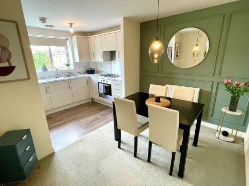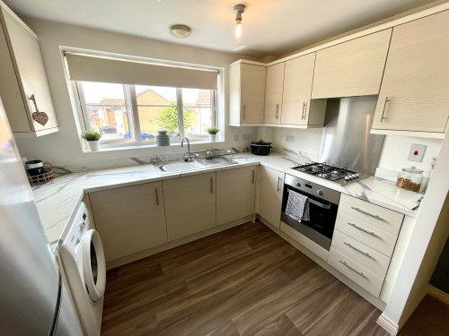 3.0m x 2.1m (9' 10" x 6' 11") Having a fashionable range of wall and base cupboards with matching work surfaces incorporating a stainless steel sink unit, built in oven, separate gas hob with splash back and overhead extractor, plumbing for washing machine and window to front.