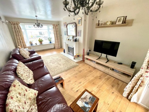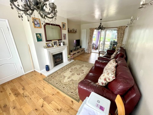 3.4m x 6.0m (11' 2" x 19' 8") Bay window to front, feature fireplace with flame effect gas fire, two radiators, laminate floor, four wall light points and patio door leading to the conservatory.