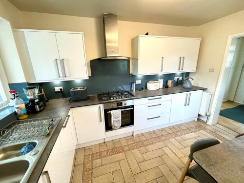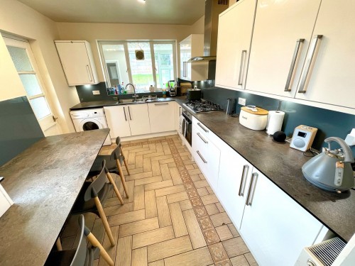 2.7m x 3.7m (8' 10" x 12' 2") Having a range of wall and base cupboards in a white high gloss finish and concealed lighting, matching work surfaces incorporating sink unit, built in oven, separate five ring gas hob with splash back, chimney style overhead extractor, integrated dishwasher, plumbing for washing machine, radiator, window to rear and door to utility area.