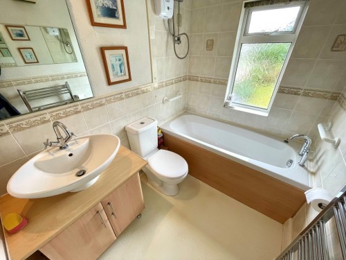 Radiator and white suite comprising, panelled bath with shower over, low flush wc and vanity unit with wash hand basin