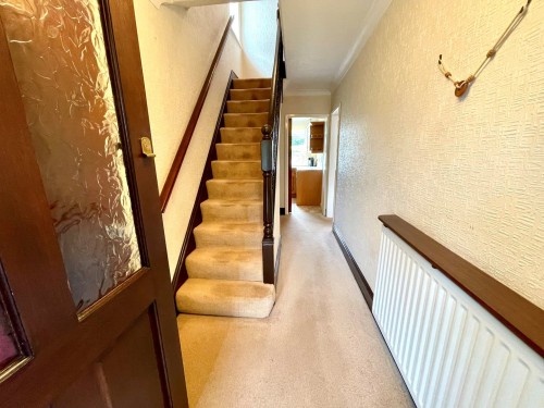 Meter cupboard, radiator, stairs off, under stairs cupboard and door to shower room.
