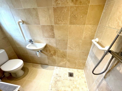 Being fully tiled to all exposed walls, mixer shower, low flush wc, wash hand basing and ceramic tiled floor.