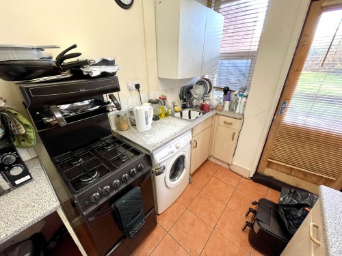 2.1m x 2.8m (6' 11" x 9' 2") Wall and base cupboards, work surface incorporating a stainless steel sink unit, splash back tiling, gas cooker point, ceramic tiled floor, plumbing for washing machine, window to rear and door to rear garden.