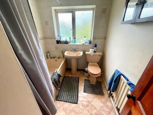 Panelled bath with shower over, pedestal wash hand basin, low flush wc and radiator.