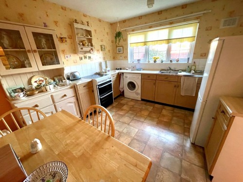 3.1m x 3.7m (10' 2" x 12' 2") Base cupboards with matching work surfaces incorporating sink unit, splash back tiling, electric cooker point, plumbing for washing machine, radiator, window to rear and built in cupboard.