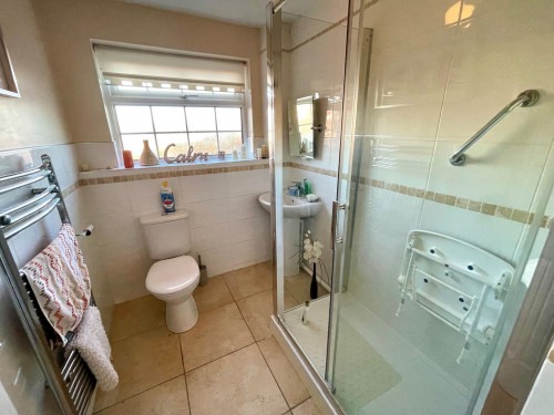 Shower enclosure with mixer shower unit, pedestal wash hand basin, low flush wc, heated towel rail and ceramic tiled floor.