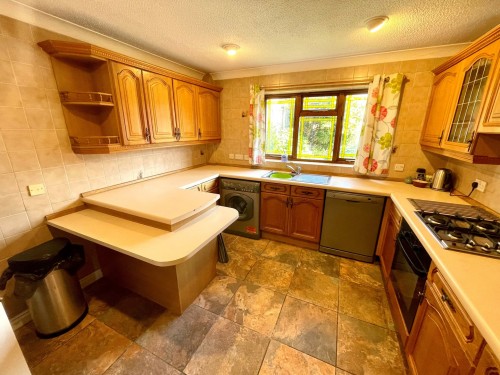 3.2m x 3.4m (10' 6" x 11' 2") Being fully tiled to all exposed walls, wall and base cupboards with matching work surfaces incorporating stainless steel sink unit, splash back tiling, built in oven, separate gas hob, overhead extractor, down lighting, window to front, radiator and plumbing for washing machine.