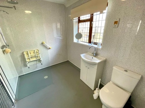 1.7m x 1m (5' 7" x 3' 3") Shower enclosure, pedestal wash hand basin, low flush wc and radiator.