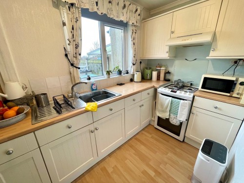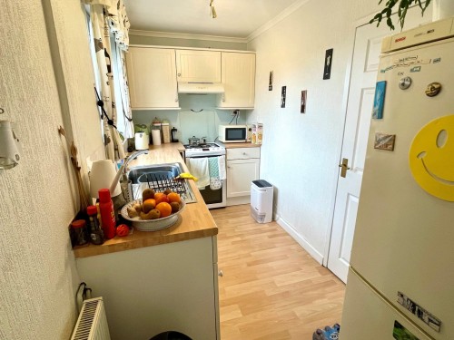 3.5m x 1.7m (11' 6" x 5' 7") Having a range of wall and base cupboards with matching work surfaces incorporating stainless steel sink unit, splash back tiling, gas cooker point, laminate floor, window to rear and radiator.