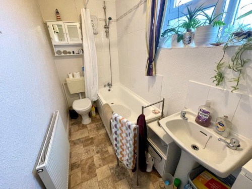 Radiator and white suite comprising, panelled bath with electric shower unit over, pedestal wash hand basin, and low flush wc