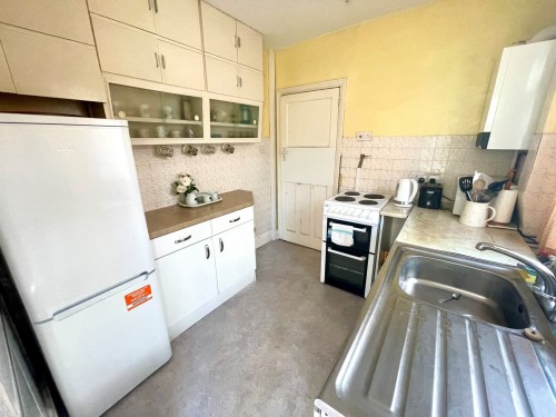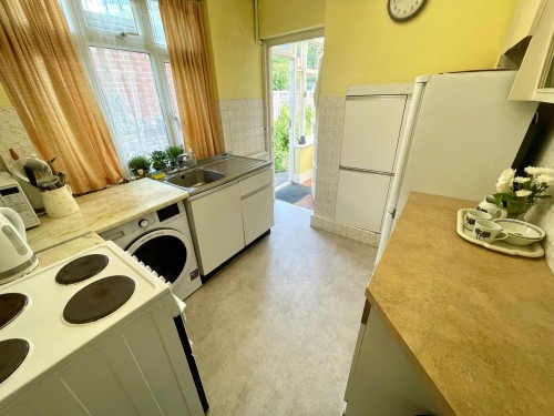 2.3m x 2.6m (7' 7" x 8' 6") Wall and base cupboards, work surfaces incorporating a stainless steel sink unit, splash back wall tiling, electric cooker point, plumbing for washing machine, window to side and door to sun room.