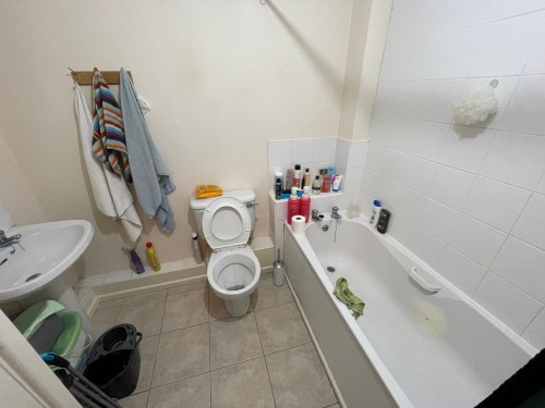 White suite comprising, panelled bath, low flush wc and pedestal wash hand basin.