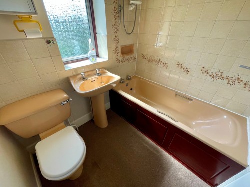 Panelled bath with electric shower unit over, pedestal wash hand basin and low flush wc.