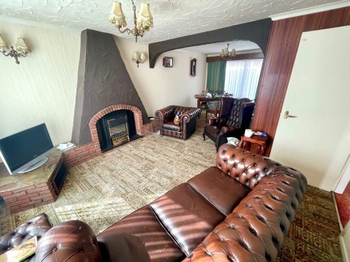 3.9m x 6.5m (12' 10" x 21' 4") Window to front, feature brick fireplace, radiator, four wall light points and patio door leading to the rear garden.