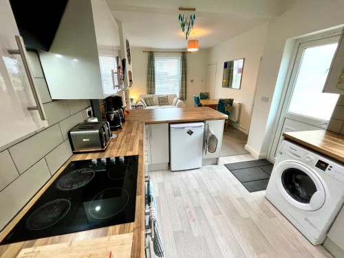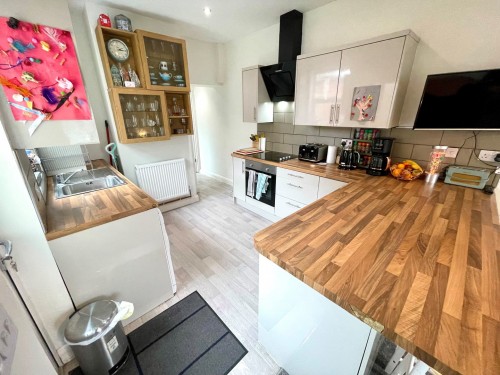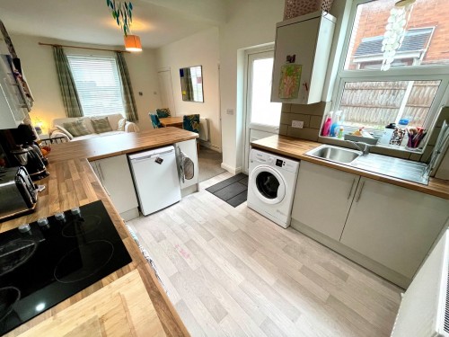 3.3m x 7.1m (10' 10" x 23' 4") Window to front, under stairs cupboard, wall and base cupboards with matching work surfaces incorporating stainless steel sink unit with mixer tap, splash back tiling, built in oven, separate electric hob, overhead extractor with concealed lighting, plumbing for washing machine, two radiators, down lighting, window to side, wall mounted central heating boiler and door to rear garden.