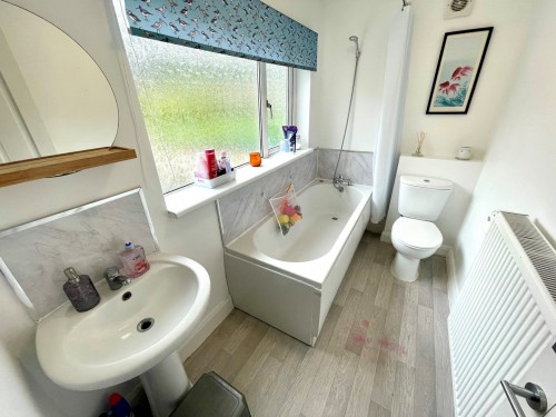 1.5m x 2.6m (4' 11" x 8' 6") Radiator and white suite comprising, panelled bath, pedestal wash hand basin and low flush wc