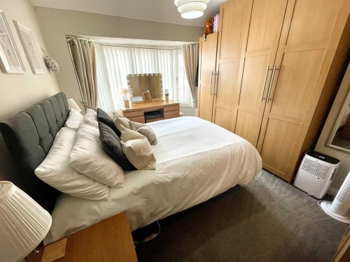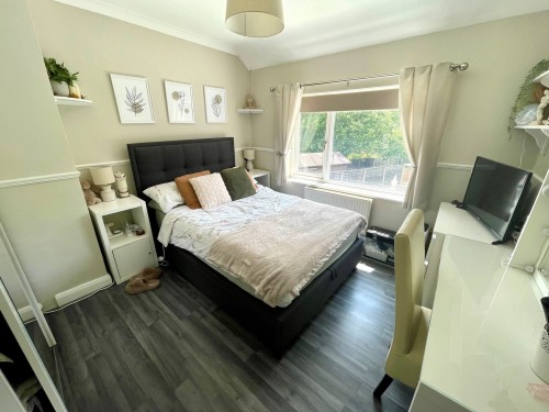 3.2m x 3.8m (10' 6" x 12' 6") Bay window to front, feature fireplace with flame effect gas fire, wall light point and radiator.