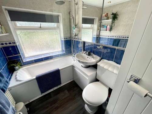 Radiator, down lighting, airing cupboard and white suite comprising, panelled bath with dual head shower over and side screen, pedestal wash hand basin and low flush wc.
