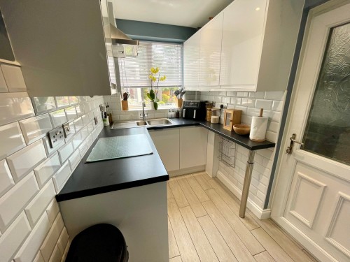 1.7m x 2.4m (5' 7" x 7' 10") Being fitted with a modern range of white wall and base cupboards in a high gloss finish, granite effect work surfaces incorporating a one and a half bowl stainless steel sink unit, splash back wall tiling, built in oven, separate electric hob with overhead extractor, window to rear and down lighting.
