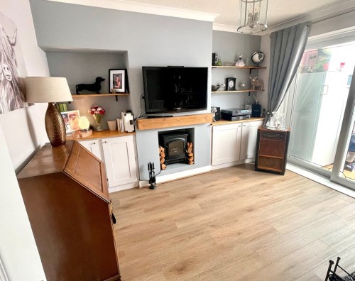 3.2m x 3.6m (10' 6" x 11' 10") Radiator, fireplace, laminate floor, built in cupboards with shelving above and patio door leading to the conservatory.