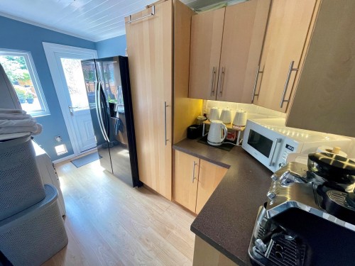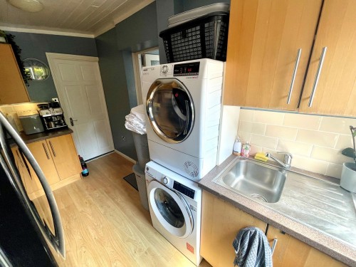 2.0m x 3.6m (6' 7" x 11' 10") Wall and base cupboards, stainless steel sink unit, plumbing for washing machine, laminate floor and doors to garage and rear garden.