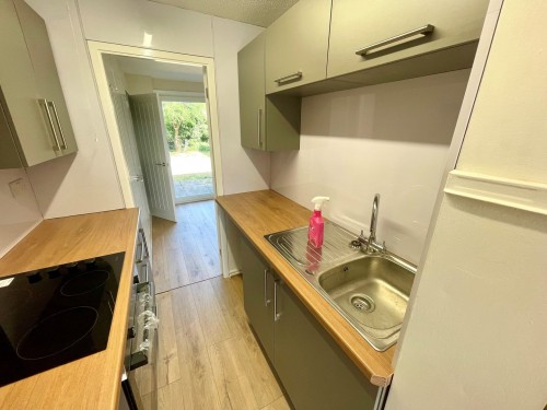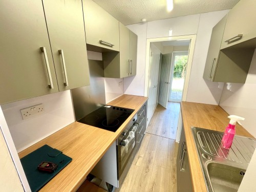 1.7m x 1.7m (5' 7" x 5' 7") Recently refitted with a fashionable range of wall and base cupboards having matching work surfaces incorporating a stainless steel sink unit, splash back, built in electric oven with separate electric hob, laminate floor and plumbing for washing machine.