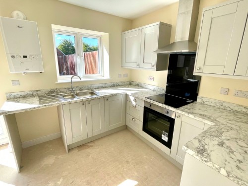 4.6m x 3.8m (15' 1" x 12' 6") max. Having a fashionable range of wall and base cupboards with matching work surfaces incorporating stainless steel sink unit, built in oven, separate electric hob, overhead extractor, down lighting, wall mounted central heating boiler, window to rear, radiator and French doors to rear garden.