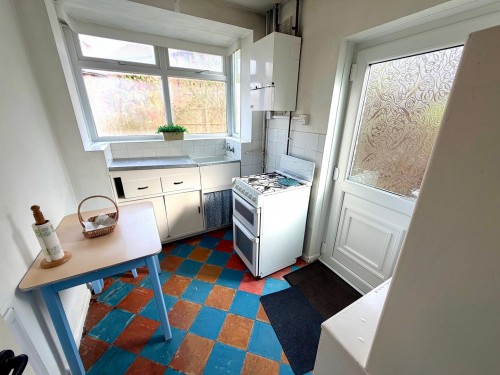 2.0m x 2.9m (6' 7" x 9' 6") Base units, enamel sink unit, splash back tiling, window to rear, radiator and UPVC door leading to the rear garden.