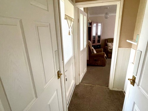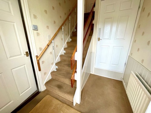 Having UPVC double glazed front door, radiator, cloaks cupboard and stairs off.